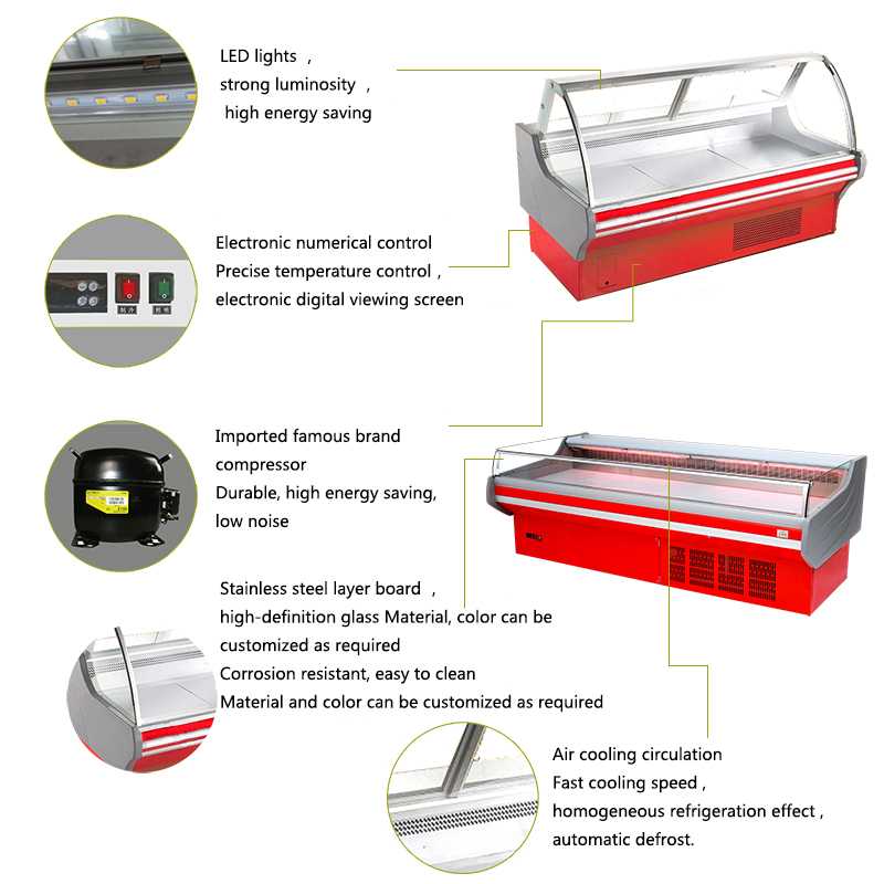 2 The imported compressor is equipped with microporous type wind nets, which makes the cool air evenly distributed.The temperature keeps constant inside the case,while still keep the food with certain humidity.For the beautiful and generous design , The product is suitable for using in supermarkets, markets, meat shop and show sales of meat products such as hotel, the guesthouse.With the semi-enclosed structure design and the feature of energy saving, the preservation effect for the food is good.